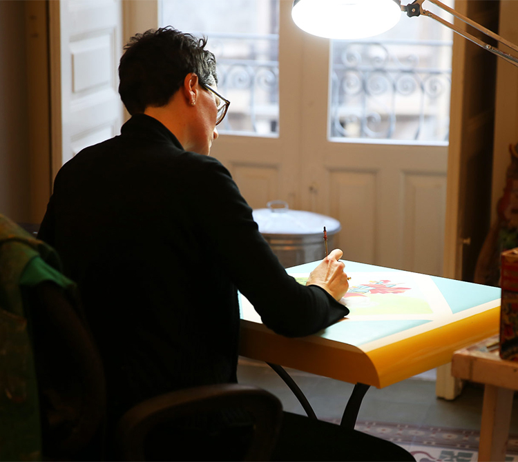Alice于1975年出生于卡塔尼亚,至今仍在这座城市生活和工作。她毕业于Conservazione dei Beni Culturali di Pisa学院,然后回到西西里,在西西里著名的马车工坊——阿奇圣安东尼奥镇(Aci Sant’Antonio)的Maestro Domenico di Mauro接受培训。许多年前,师徒命运的交汇就已经注定:对Alice而言,发现马车源于她对“艺术品”的兴趣和“家族本源”。他们俩与一小群艺术家一起,讲述着一个遥远但尚未遗失的世界的故事。作为继承这一古老而复杂的装饰艺术的极少数马车画师中唯一的女性,她从多个方面深入研究民间艺术传统。她从对西西里民间传说及其传统主题的个人解读中汲取灵感。除了制作彩绘家具、绘画和日常用品外,她还从事室内设计、时装和戏剧,都带有隐约的反讽意味和一丝怀旧之情。