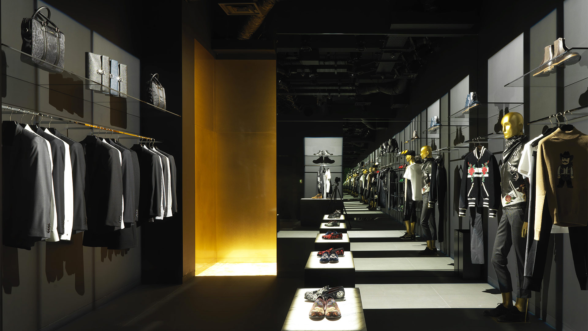 精品店面积为550平方米。建筑设计和装饰均通过明暗对比效果,展现西西里独特而充满活力的明媚光采。精品店犹如紧凑的黑色立体空间,投射的灯光以规律的间隔照亮店内展示的系列作品。天花板上的400个可移动聚光灯开关自如,使产品或迸放炫目色彩,或隐匿于阴影之中,营造出阳光灿烂的光线氛围。