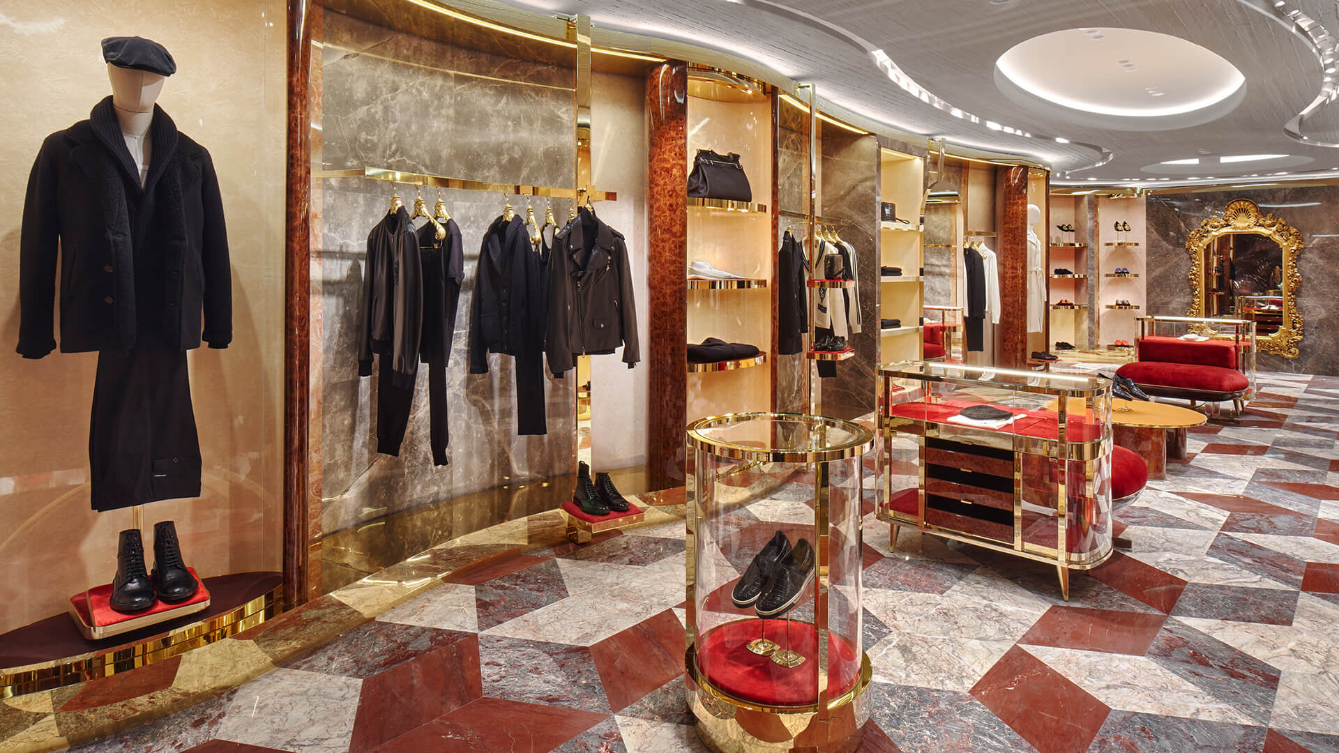 精品店内陈列男士和女士成衣、配饰和高级珠宝系列,并设有Sartoria Su Misura定制服务区。